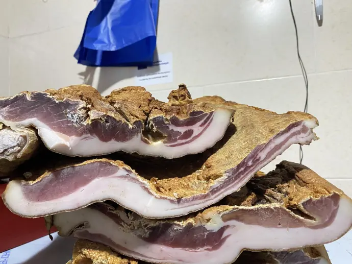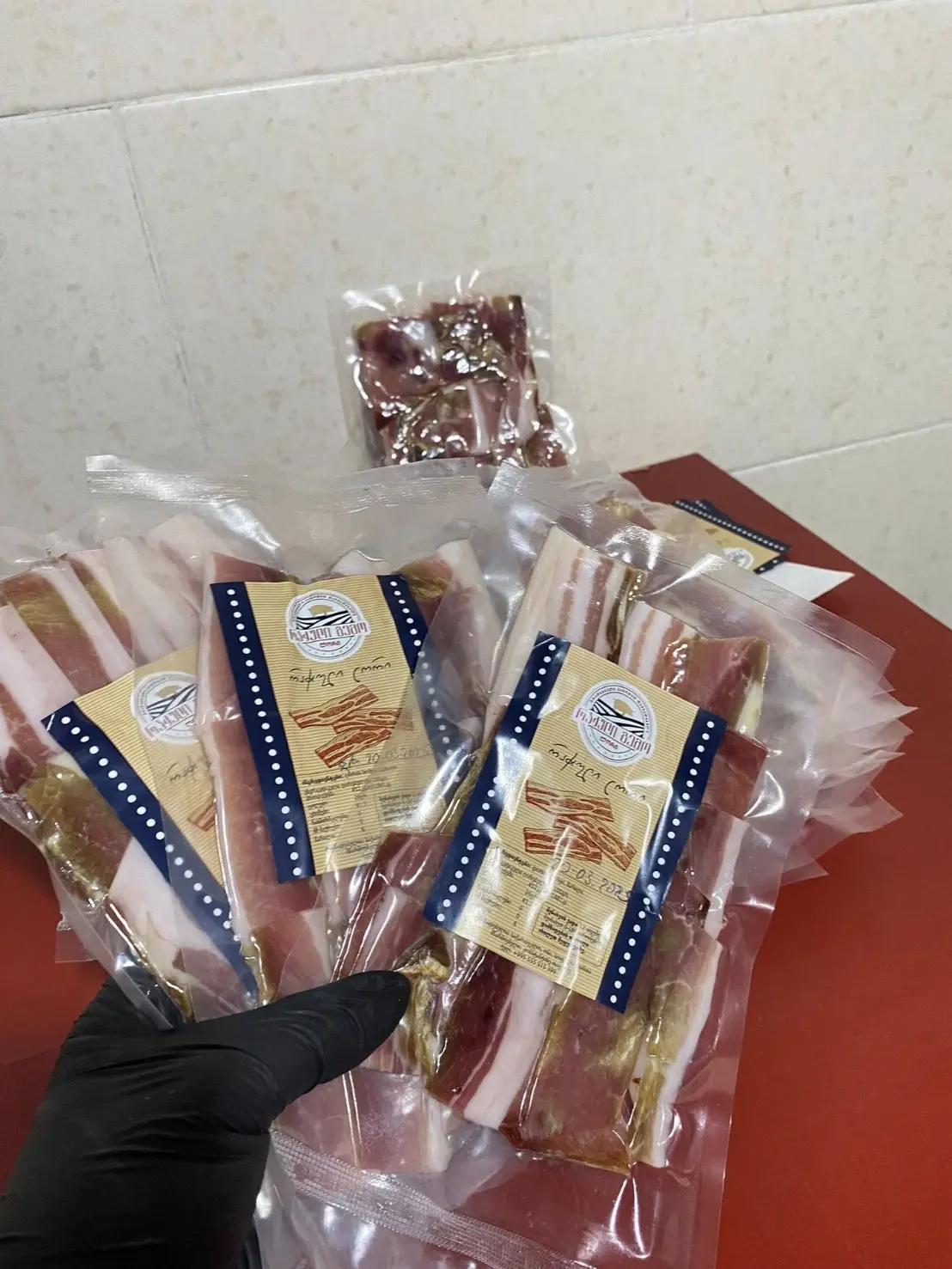 Traditional ham from Racha. The ham is produced from the Georgian pig breeds grown in the natural environment, which is reflected in the flavour of final products. In the production process only pork and salt is used, which is then smoked over a lengthy period for its distinct flavour palette. We then carefully slice and package our products, which can readily be enjoyed by customers. Our production facilities are HASSP compliant, which ensures the quality of the final product.